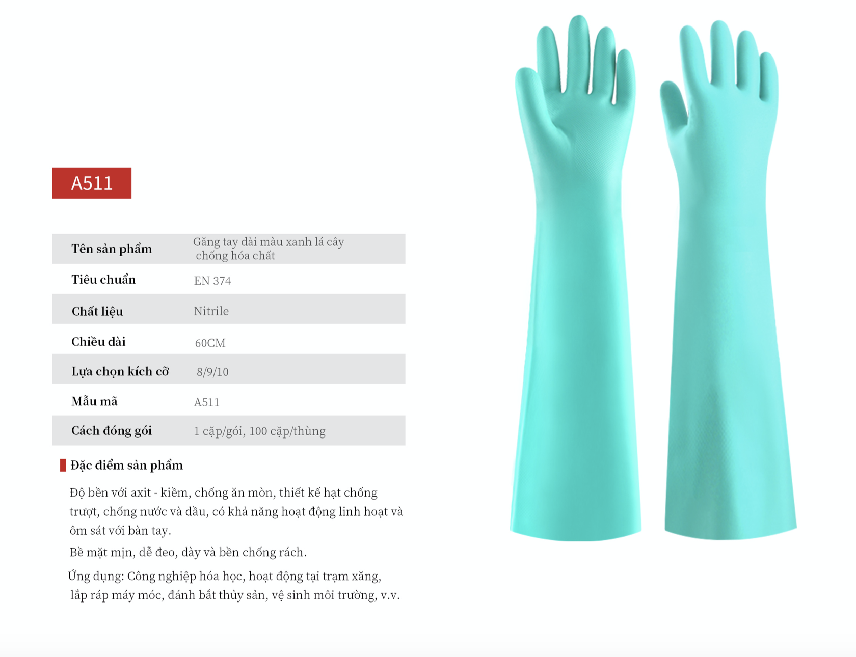 Độ bền với axit – kiềm, chống ăn mòn, thiết kế hạt chống trượt, chống nước và dầu, có khả năng hoạt động linh hoạt và ôm sát với bàn tay.