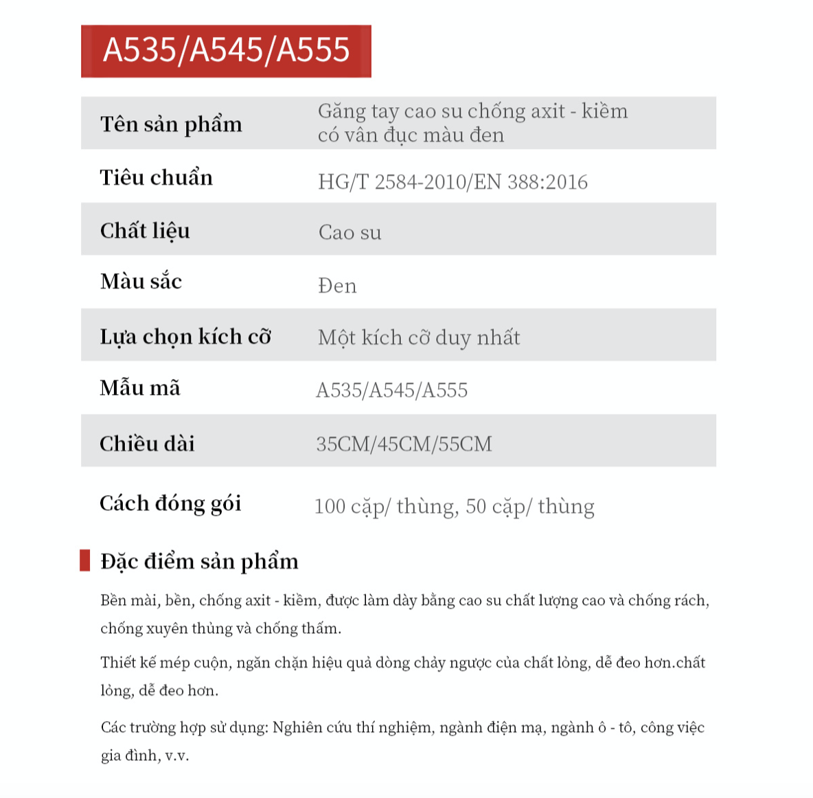 Bền mài, bền, chống axit – kiềm, được làm dày bằng cao su chất lượng cao và chống rách, chống xuyên thủng, chống thấm.