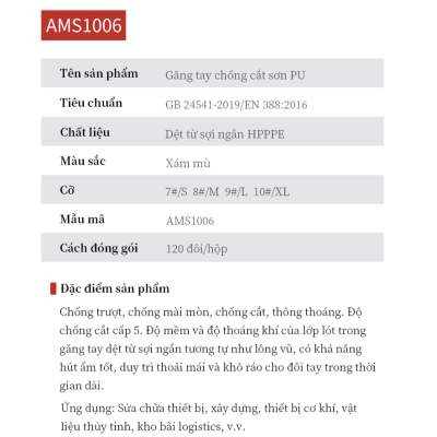 | Tên Sản phẩm | Găng tay chống cắt cấp độ 5 AMS AMS1006 |