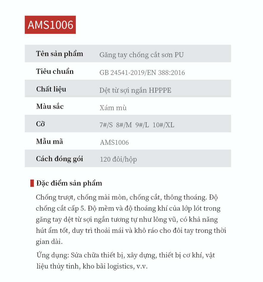 – Găng tay chống cắt cấp độ 5 AMS AMS1006 sản phẩm bảo hộ lao động cao cấp, đạt tiêu chuẩn EN388 của châu Âu