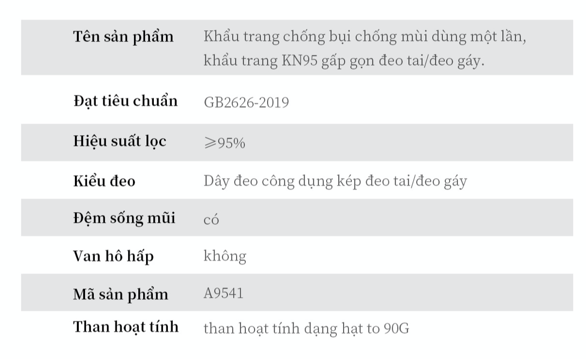 – Bảo vệ hô hấp khỏi hạt bụi không chứa dầu và các chất, hiệu quả lọc trên 95%