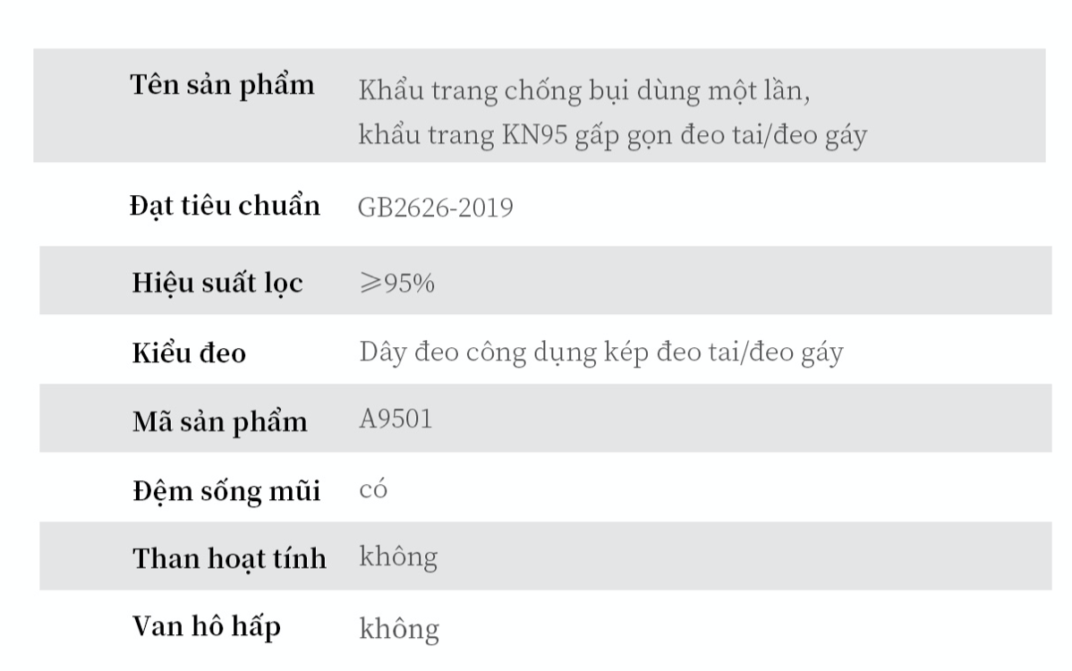 Khẩu trang KN95, quy cách A9501